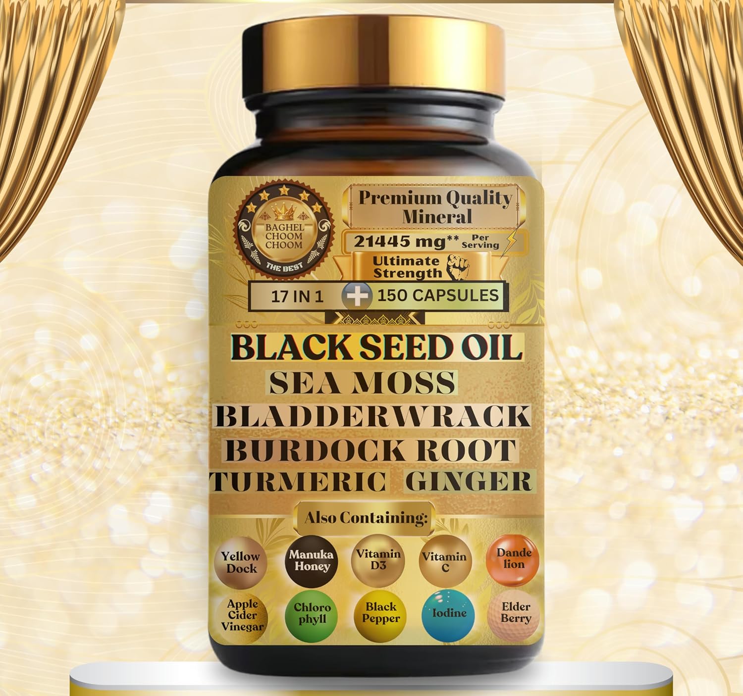 The ultimate blend of high-potency Black Seed Oil and a substantial dose of Sea Moss encapsulated, fulfilling your search for maximum strength and efficacy – Introducing Baghel Choom Choom’s all in 1 supplement, an all-in-one mineral powerhouse featuring 7000 mg of pure Black Seed Oil, 5000 mg of Sea Moss, and 3000 mg of Ashwagandha root. This potent fusion offers a holistic solution for total body wellness. Moreover, this unique combination ensures comprehensive support for your body’s well-being, making it an indispensable part of your daily routine.