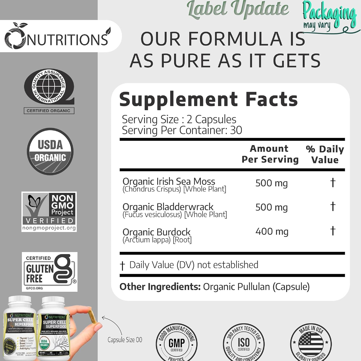 O NUTRITIONS Super Cell Superfood Sea Moss – USDA Certified Organic Sea Moss Capsules for Men and Women – Advanced Supplements with Irish Sea Moss, Bladderwrack, Burdock Root