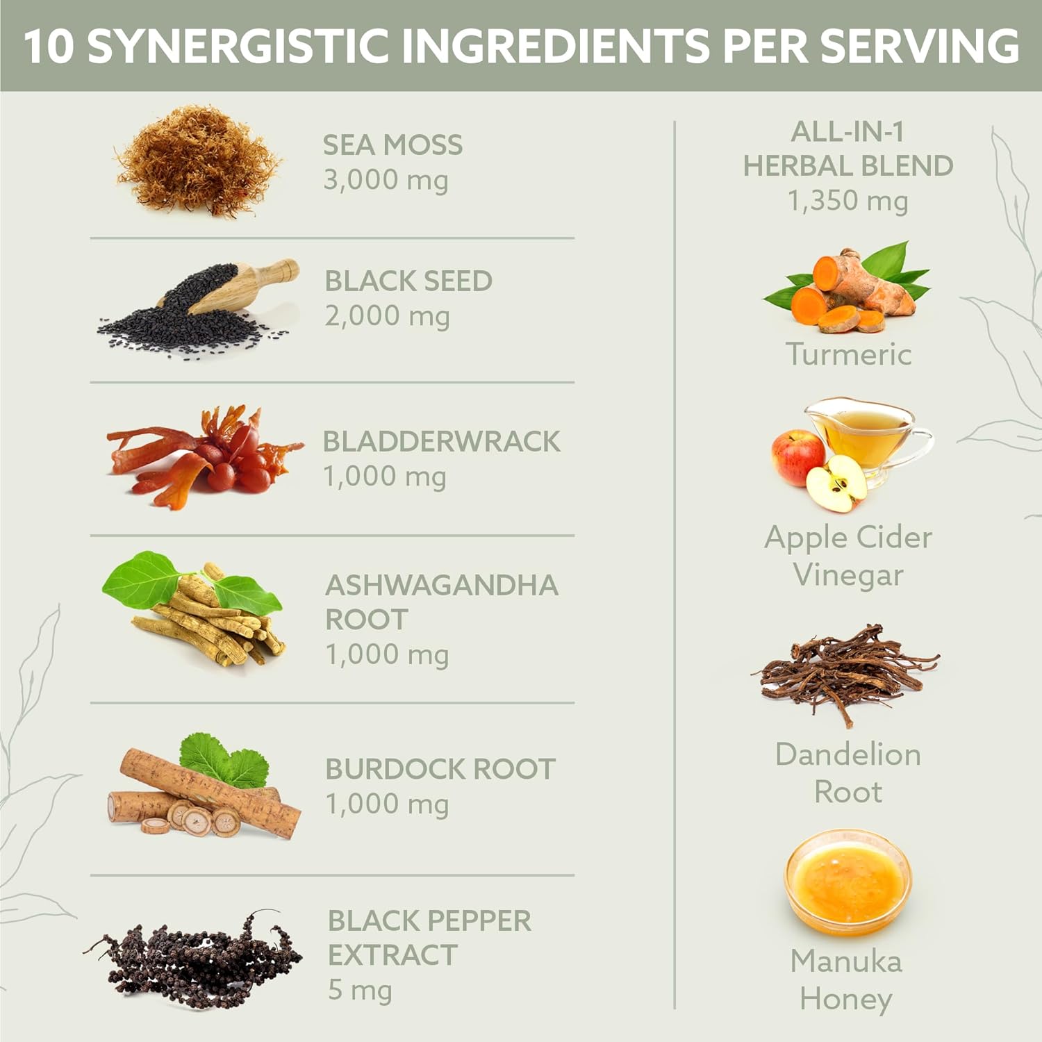 Sea Moss, Black Seed, Tumeric, Apple Cider Vinegar, Dandelion Root, Manuka Honey, Ashwagandha, Bladderwrack, Burdock Root, Black Pepper Extract Cascara Sagrada, Senna Leaf, Psyllium Husk, Flaxseed, L. Acidophilus, Licorice Root, Aloe Vera, Omega-3 Fatty Acids, MCT Oil