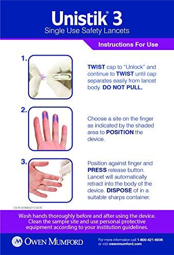 Blood sampling made easy! Just twist the cap to unlock, place against your finger and press the release button. Diabetics can enjoy safe, comfortable and simple blood glucose testing with Unisex 3 pre-set single use safety lancets. The Unistik 3 comes pre-set and ready for use. The needle point is hidden before use and automatically retracts after use To avoid accidental needle sticks and cross infection. The pre-loaded stainless steel lancet penetrates the skin to precisely the right Depth. The Unistik 3 features the comfort Zone system – a series of 8 dots that when pressed against the skin sends a comforting message to the brain, providing a distraction that makes sampling virtually pain-free. A side activation button increases patient comfort by reducing the amount of pressure placed on the test site. Normal: (Yellow colored body) – Medium blood flow for standard blood glucose testing gauge: 23g Depth: 1.8mm package Size: 100-Count