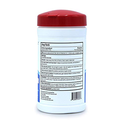 Pre-moistened, soft, pliable 70% Isopropyl Alcohol first aid wipes packaged in a canister with pull through pop-top domed lid.