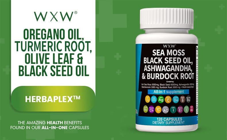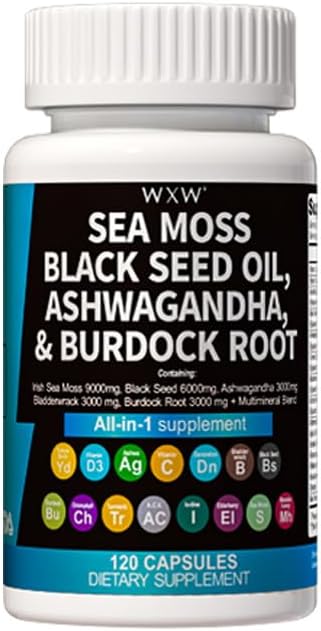 This all-in-one dietary supplement combines the power of sea moss, black seed oil, ashwagandha, burdock root, and more for a comprehensive wellness boost. Sea moss provides essential minerals and nutrients, while black seed oil offers anti-inflammatory properties. Ashwagandha, an adaptogen, helps the body cope with stress and anxiety. Burdock root supports digestion and liver health. With added vitamins C, D3, and other botanicals like elderberry, manuka, dandelion, and yellow dock, this formula aims to nourish your body from the inside out. The convenient capsule form makes it easy to incorporate into your daily routine. Prioritize your well-being with this nutrient-dense, all-encompassing supplement.