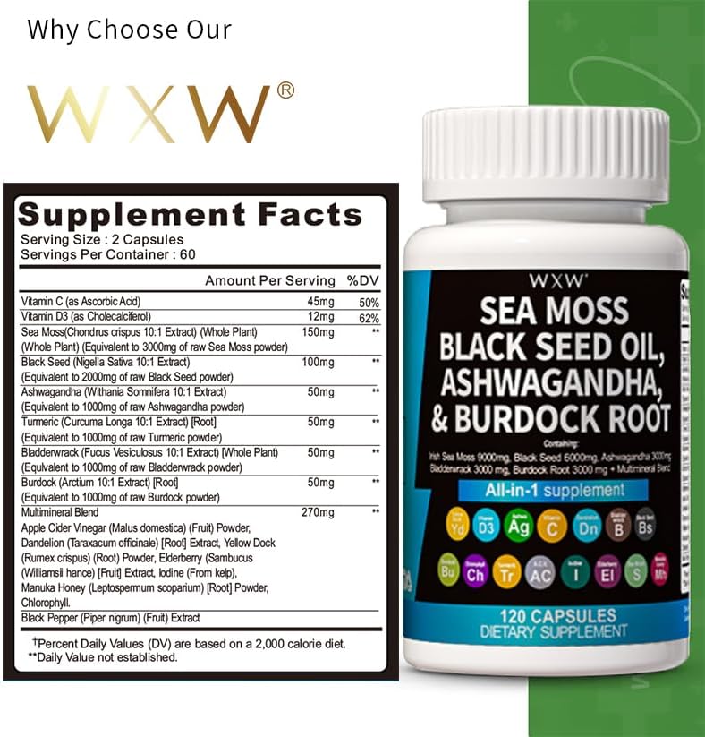 Potent Blend: A powerful combination of Sea Moss 3000mg, Black Seed Oil 2000mg, Ashwagandha 1000mg, Turmeric 1000mg, Bladderwrack 1000mg, Burdock 1000mg, and essential vitamins & minerals.