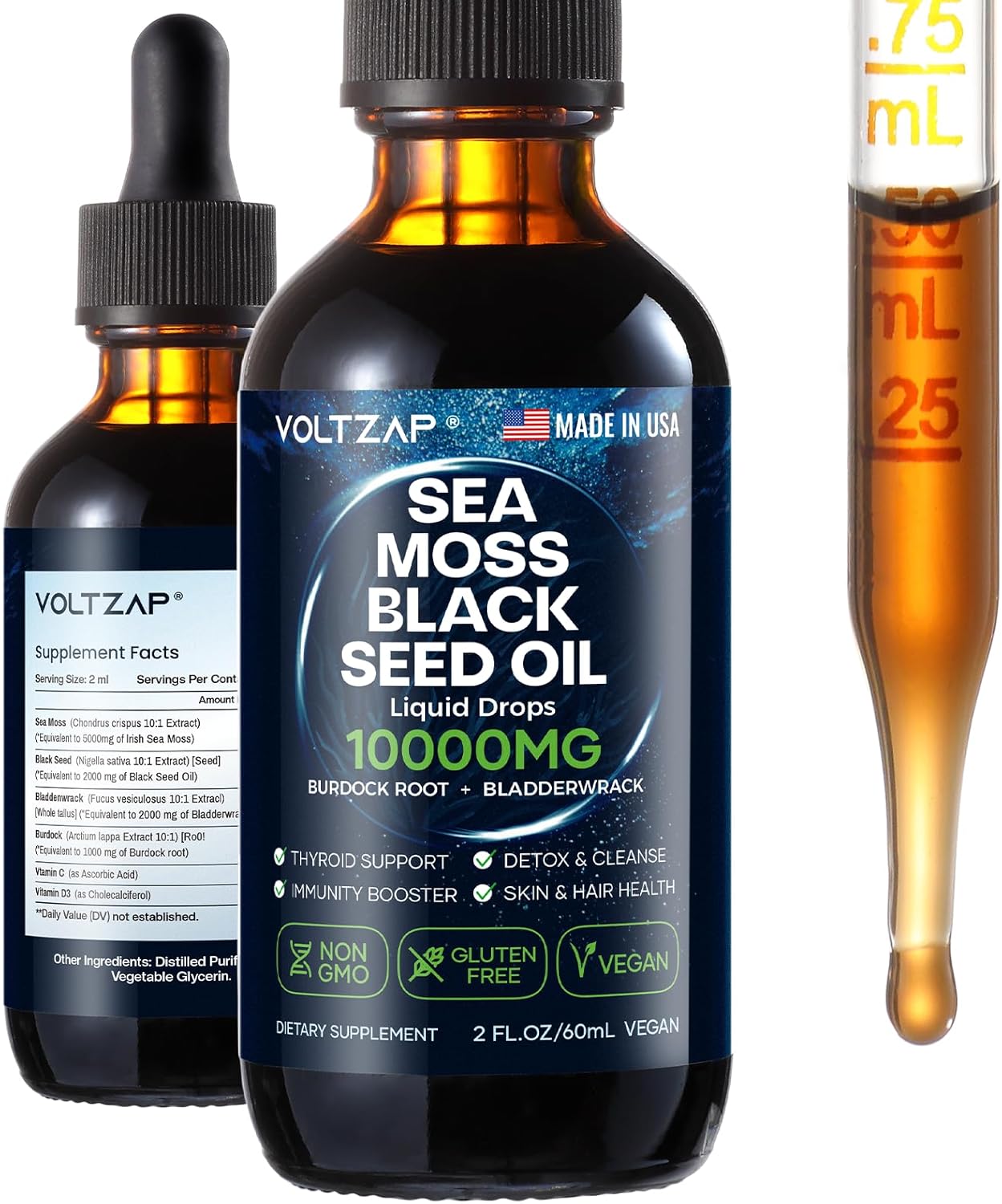 Sea Moss 3000mg Black Seed Oil 1000mg: with Burdock Root 600mg Bladderwrack 800mg & Vitamin C Sea Moss Black Seed Oil Drops for Immune System, Gut, Skin & Energy – Vegan & Non-GMO 2fl.oz