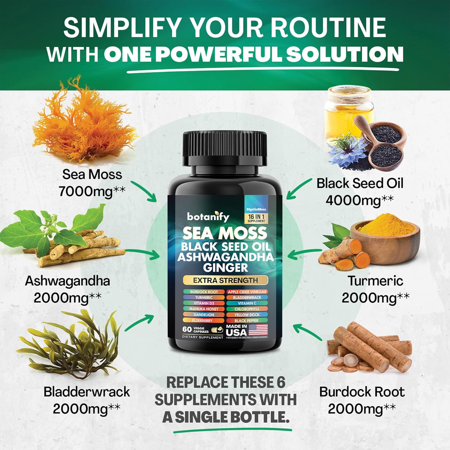 Discover Botanify’s innovative Sea Moss Formula, an all-encompassing blend of Sea Moss, Black Seed Oil, Ashwagandha, Bladderwrack, and Burdock Root, enhanced with over 12 potent ingredients. Enjoy the benefits of Turmeric Curcumin, Apple Cider Vinegar, Chlorophyll, Manuka Honey, and Ginger all in one convenient capsule. Our formula provides an excellent alternative to traditional sea moss gummies, black seed oil gummies, and ashwagandha gummies.
